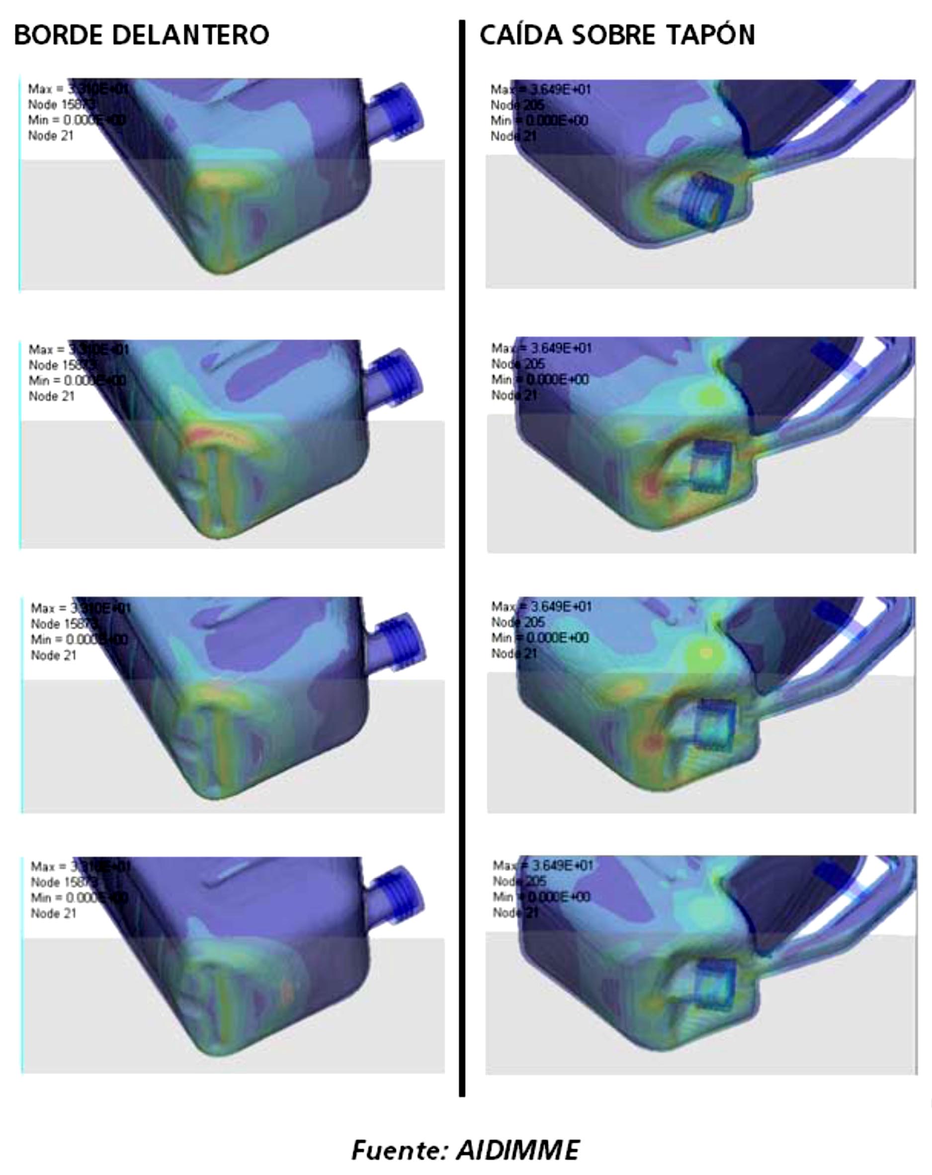 Se han estudiado las propiedades de compatibilidad química entre el envase y el producto químico a contener, utilizando líquidos patrones y comparando los resultados con modelos teóricos calculados. La comparación de resultados obtenidos por simulaciones mediante elementos finitos con los obtenidos en el laboratorio ha permitido optimizar método, detectando las zonas más débiles del envase y proponiendo una optimización del diseño que mejore su comportamiento.