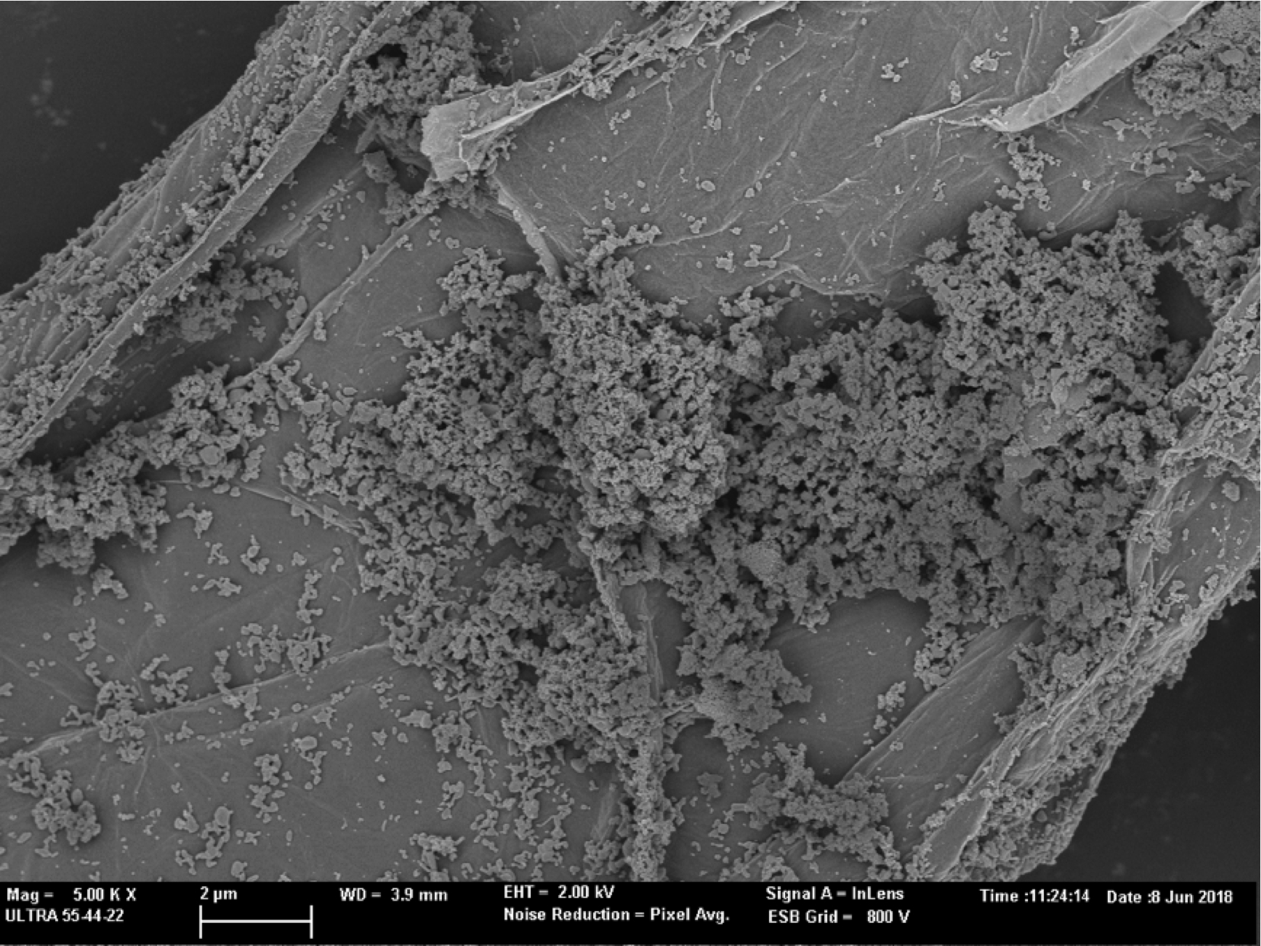 La conductividad de los derivados del grafeno favorece la deslocalización del electrón sobre su superficie cuando se genera el par electrón/hueco en el proceso fotocatalítico. De esta forma se evita la recombinación del par electrón/hueco y por tanto la eficiencia del proceso fotocatalítico aumenta al tener un mayor tiempo de vida estas especies reactivas. La imagen muestra una micrografía de una lámina de óxido de grafeno reducido recubierta con nanopartículas de TiO2 y ZnO.