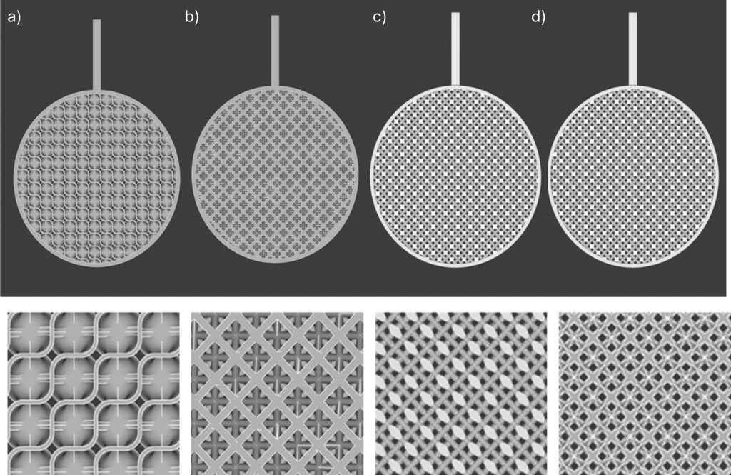 Tras una selección previa entre más de 20 tipos de estructuras, se han obtenido y comparado las cuatro con mayor potencial inicial para su fabricación y uso como electrodos porosos, Figura 2. Para ello se realizaron diseños con el mismo espesor y rango de superficie y tamaño de poro y posteriormente se fabricaron en distintas tecnologías y materiales, Figura 3.