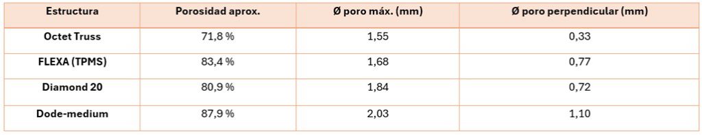 Para la selección de las estructuras porosas, se estudiaron las dos grandes familias existentes, las basadas en generación de celosías (lattices) y las basadas en estructuras de superficies mínimas triples periódicas (TPMS).