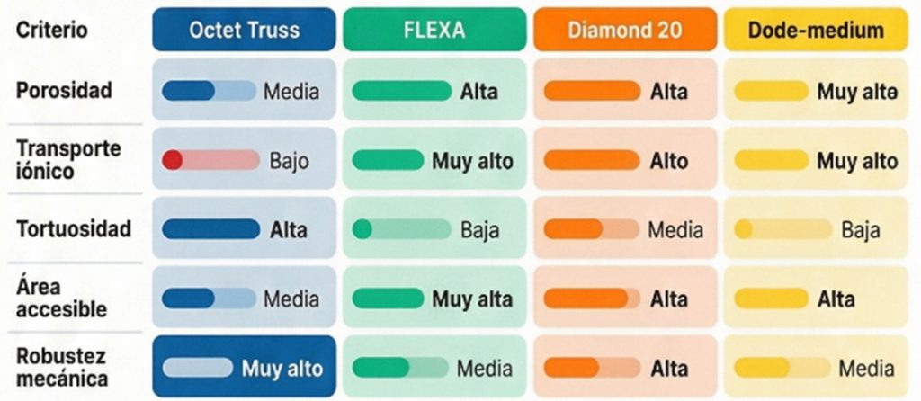 - FLEXA (TPMS), combina alta porosidad, baja tortuosidad y geometría continua, favoreciendo transporte de masa lo que se traduce en eficiencia electroquímica.