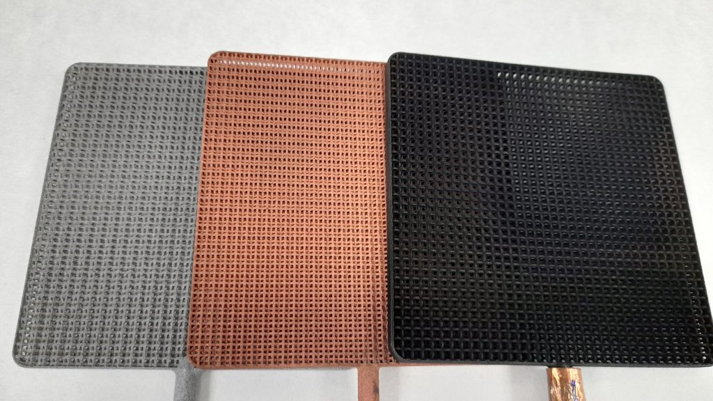 - Diseño de la estructura en formato electrodo de diferentes geometrías, con tamaños de 1, 20 y 100 cm2 de área lineal por cara. Se obtuvieron 9 diseños posibles, de los cuales se seleccionaron para su fabricación 4.
